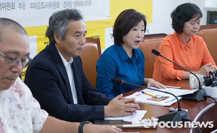 (서울=포커스뉴스) 심상정(왼쪽 세번째) 정의당 상임대표가 28일 오전 서울 여의도 국회에서 열린 낙동강 수질, 퇴적토 조사 및 영풍석포제련소 주변환경조사 관련 4대강 실태조 발표 기자회견에 참석해 인사말을 하고 있다.