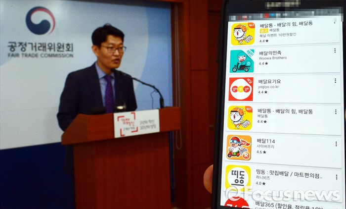 (세종=포커스뉴스) 28일 오전 세종시 정부세종청사 공정거래위원회에서 김문식 전자거래과장이 6개 배달앱 사업자의 전상법 위반행위 시정조치에 대한 브리핑을 하고 있다. 핸드폰 화면은 배달앱 검색시 노출순.