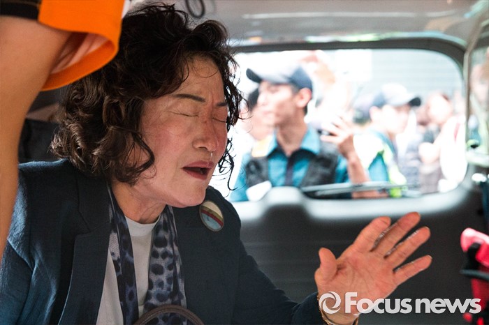 (서울=포커스뉴스) 28일 오후 서울 서대문구에 위치한 '화해·치유 재단' 사무실 인근에서 열린 기자간담회에 참석한 김태현 이사장이 간담회 후 건물을 빠져 나가다 활동가들이 뿌린 캡사이신을 얼굴에 맞고 119 구급차에 탑승해 고통스러워 하고 있다.