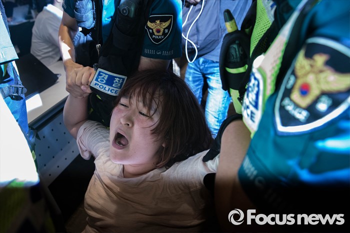 (서울=포커스뉴스) '화해·치유 재단'이 공식 출범한 28일 오전 서울 중구에 위치한 한 건물에서 열린 재단 출범 이사장 기자간담회장에서 재단 출범에 반대하는 대학생들이 회견장을 점거, 농성을 벌이고 있다.