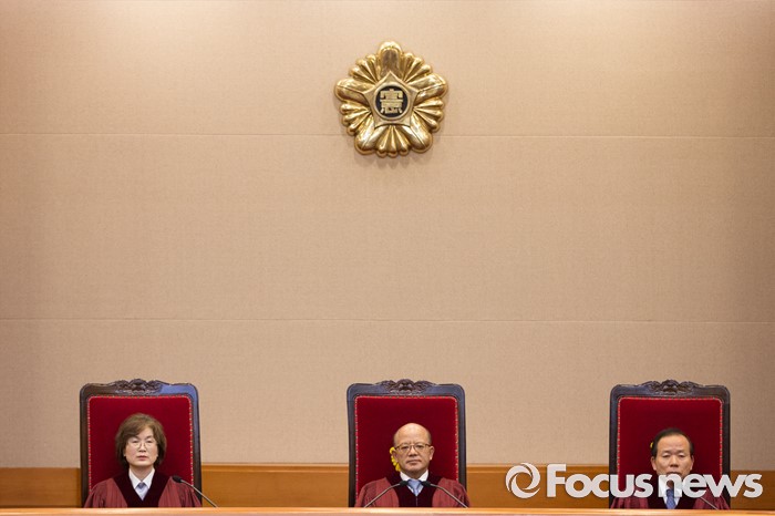 김영란 전 국민권익위원장이 추진한 김영란법은 2015년 3월3일 국회 본회의를 통과해 제정됐고 사회 혼란을 방지하기 위해 1년 6개월의 시행 유예 기간을 뒀다.(서울=포커스뉴스) 박한철(가운데) 헌법재판소장과 법관들이 김영란법 위헌 여부 판결을 위해 28일 오후 서울 종로구 헌법재판소 대심판정에 착석해 있다. 2016.07.28 이승배 기자