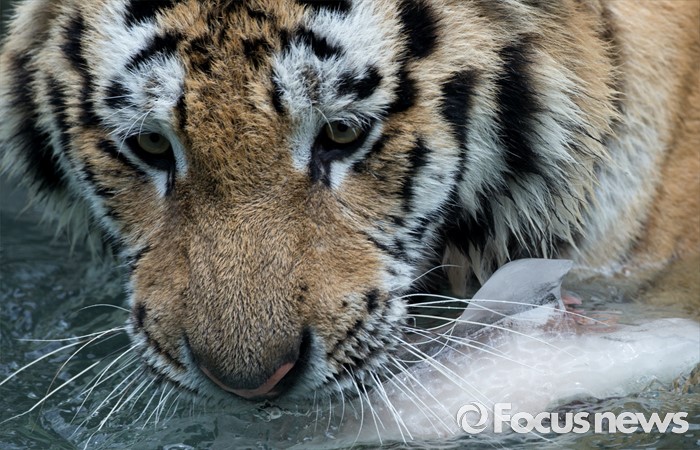 (과천=포커스뉴스) 28일 오후 경기도 과천 서울동물원에서 시베리아 호랑이가 얼린 닭고기를 먹으며 더위를 식히고 있다.