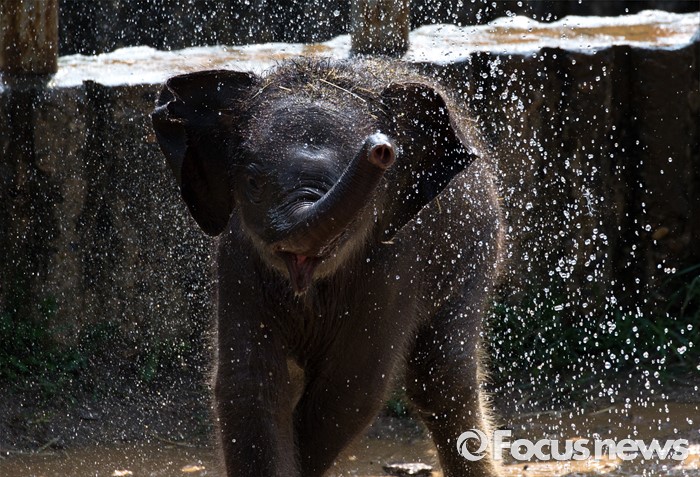 (과천=포커스뉴스) 28일 오후 경기도 과천 서울동물원에서 아기 코끼리가 물줄기를 맞으며 더위를 식히고 있다.