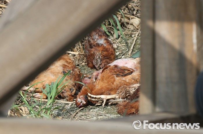 (괴산=포커스뉴스) 폭염으로 가축 폐사가 늘고있는 가운데 28일 오후 충북 괴산의 양계농가에서 닭이 폐사돼 있다.