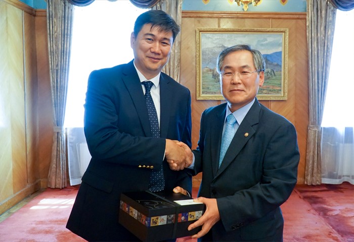 (서울=포커스뉴스) 몽골 국회 사무총장의 공식 초청으로 몽골을 방문 중인 우윤근(오른쪽) 국회 사무총장이 28일 정부청사에서 촐몽(Tsedev TSOLMON) 몽골 국회 사무총장과 악수하고 있다. 이날 양국은 국회 및 사무처 간 교류 활성화를 위한 업무협약을 체결했다. <사진제공=국회사무처>