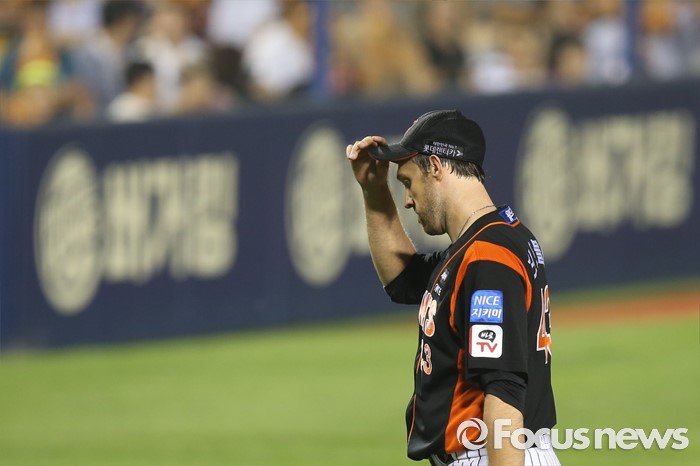 (서울=포커스뉴스) 28일 오후 서울 잠실구장에서 열린 2016 타이어뱅크 KBO리그 롯데-LG 경기에서 5회말 롯데 림드블럼이 투수 교체되어 더그아웃으로 향하고 있다.