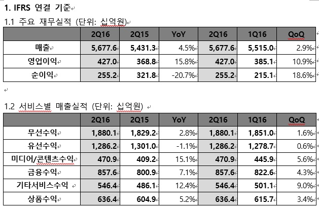 신광석 KT 전무는 “2016년 2분기는 KT가 그동안 노력한 질적 영업∙비용 혁신∙그룹 경영 모두가 결실을 거둬 2012년 1분기 이후 4년 만에 4000억원대의 분기 영업이익을 올릴 수 있었다”고 설명했다.KT 2분기 영업실적.<표제공=KT>