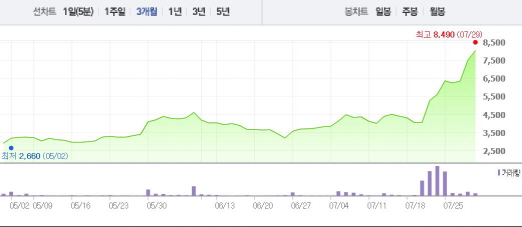 이는 2주일 전 주가(4415원)와 비교했을 때 82.10% 상승한 수치다.