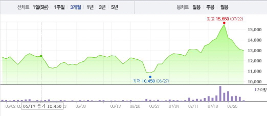 NEW는 29일 오전 9시44분 현재 전 거래일 대비 1.15%(150원) 하락한 1만2950원에 거래되고 있다.