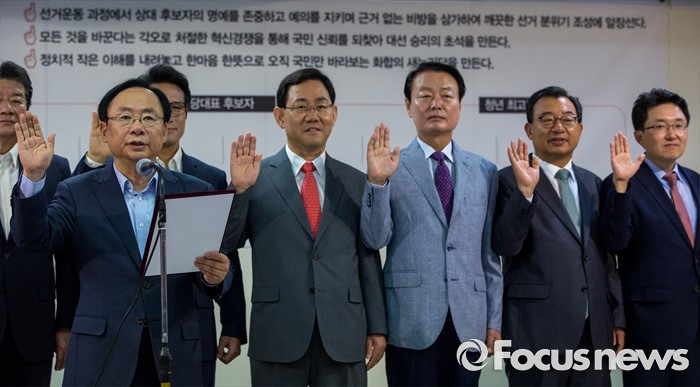 (서울=포커스뉴스) 새누리당 전당대회 당대표 후보들이 29일 오전 서울 여의도 새누리당사에서 열린 '4차 전당대회 혁신과 화합의 선거 서약식'에 참석해 선서를 하고 있다. 왼쪽부터 이주영, 정병국, 주호영, 한선교, 이정현, 김용태 후보.