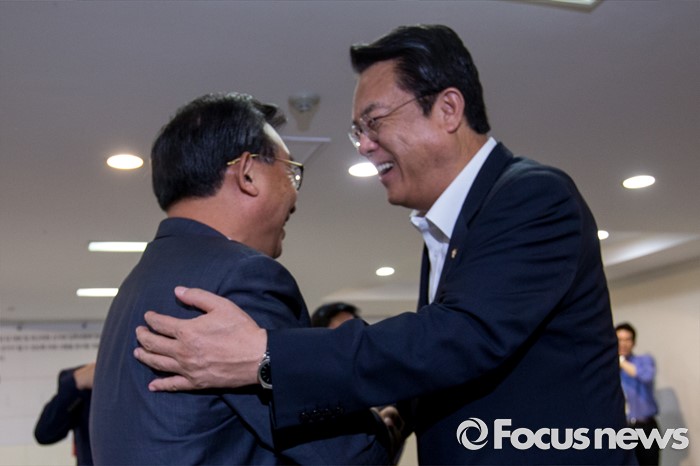 (서울=포커스뉴스) 정진석(오른쪽) 새누리당 원내대표와 이정현 의원이 9일 오전 서울 여의도 새누리당사에서 열린 '4차 전당대회 혁신과 화합의 선거 서약식'에 참석해 대화 하고 있다.