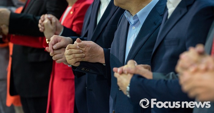 (서울=포커스뉴스) 새누리당 전당대회 당대표 및 최고위원 후보들이 9일 오전 서울 여의도 새누리당사에서 열린 '4차 전당대회 혁신과 화합의 선거 서약식'에 참석해 손을 맞잡고 있다.