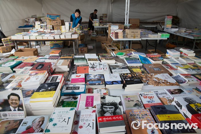 (서울=포커스뉴스) 29일 오전 서울 여의도 한강공원 마포대교 밑에서 열린 2016 한강몽땅 '지상 최대 헌책방 축제'에서 책방 주인들이 책을 정리하고 있다.