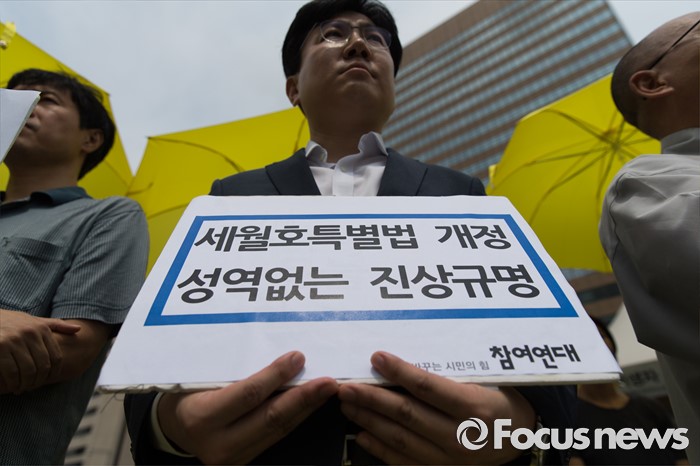 (서울=포커스뉴스) 29일 오후 서울 광화문광장에서 세월호특조위 진상규명활동 보장 촉구 기자회견에 참석한 참여연대 관계자들이 세월호특별법 개정 촉구하는 손피켓을 들고 있다.