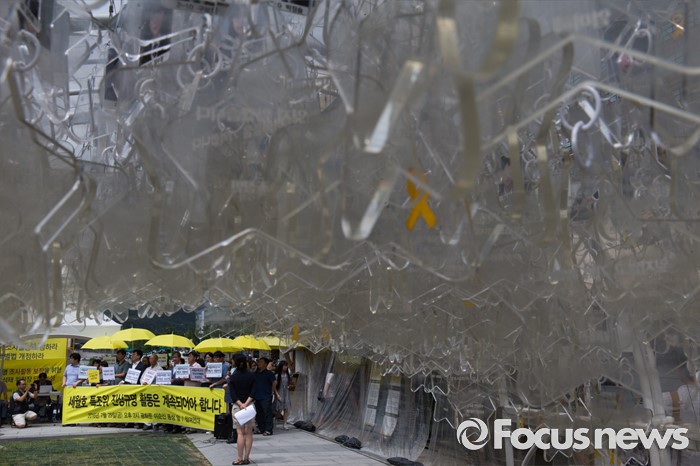 (서울=포커스뉴스) 참여연대 관계자들이 29일 오후 서울 광화문광장에서 세월호특조위 진상규명활동 보장 촉구 기자회견에 참석한 참여연대 관계자들이 세월호특별법 개정을 촉구하고 있다.