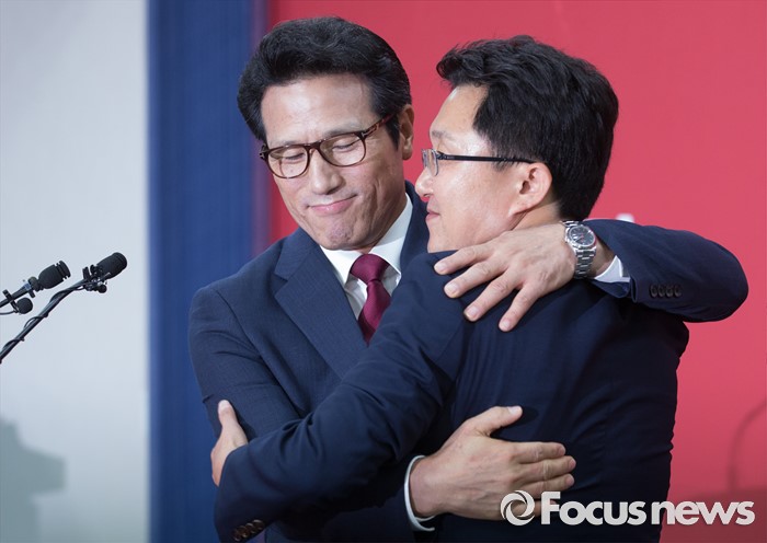 한편 이번 단일화 협의에 참여하지 않은 주호영 의원은 앞서 "전당대회 과정에서 새누리당이 이 지경에 이르게 한 책임이 큰 계파가 또다시 당권을 장악하려는 시도가 노골화되면 단일화를 적극 고려할 것"이라며 가능성을 열어둬, 경선 레이스 중 추가 단일화가 있을 수 있음을 시사했다.(서울=포커스뉴스) 전당대회 대표최고위원 출마를 선언한 정병국(왼쪽), 김용태 새누리당 의원이 29일 오후 서울 여의도 당사에서 단일화 발표 기자회견 중 포옹하고 있다. 이날 두 의원은 여론조사를 통해 정병국 의원으로 단일화를 결정했다. 2016.07.29 박동욱 기자