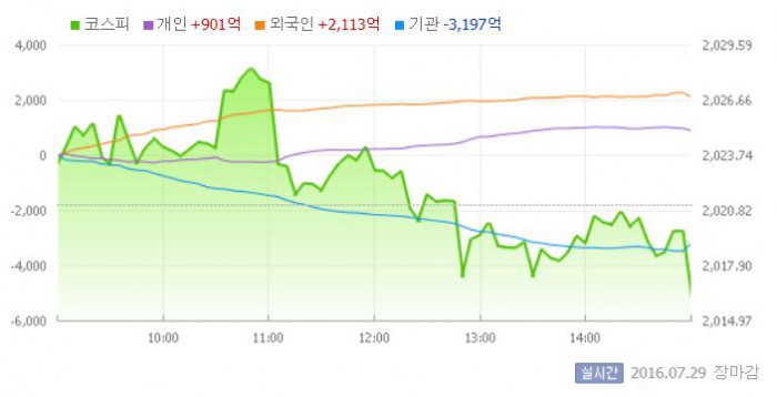 29일 코스피지수는 전일 대비 0.24%(4.91포인트) 내린 2016.19에 장을 마쳤다. 코스닥지수는 전날 보다 0.35%(2.46포인트) 오른 706.24에 마감했다.