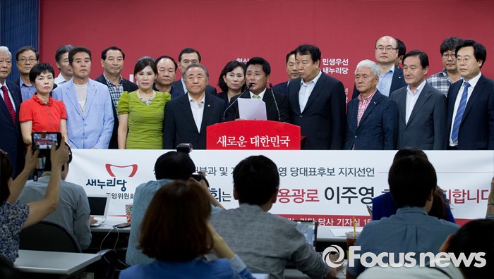 (서울=포커스뉴스) 새누리당 중앙위원회 17개 분과 위원장들과 상임전국위원, 지도위원 등이 29일 오후 서울 여의도 당사에서 전당대회 출마를 선언한 이주영 의원 지지 기자회견을 하고 있다.