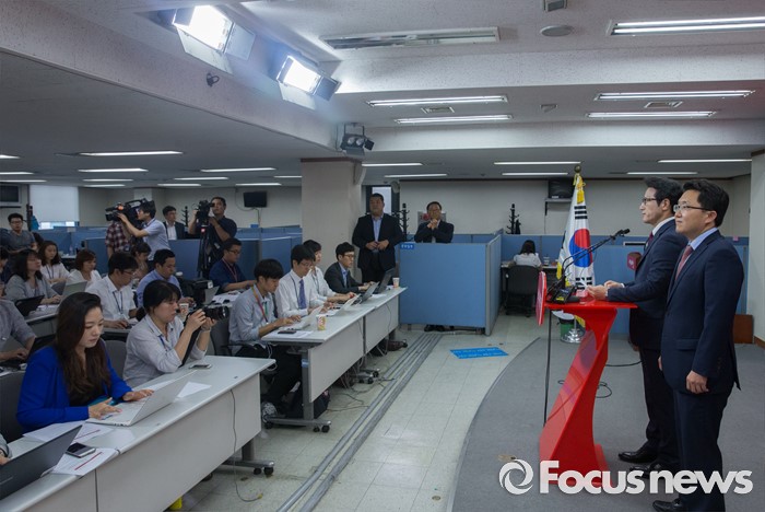 (서울=포커스뉴스) 전당대회 대표최고위원 출마를 선언한 정병국(왼쪽), 김용태 새누리당 의원이 29일 오후 서울 여의도 당사에서 단일화 발표 기자회견을 하고 있다. 이날 두 의원은 여론조사를 통해 정병국 의원으로 단일화를 결정했다.