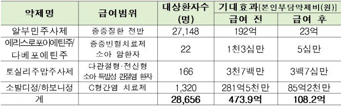 복지부는 이번 건강보험 적용 확대로 시행 첫해 총 3만여명의 환자가 보험혜택을 받을 것으로 예상되며, 환자 본인부담 약제비가 연간 366억원 감소될 것으로 기대했다.