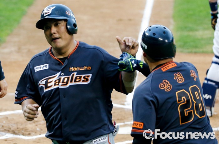 (서울=포커스뉴스) 26일 서울 잠실구장에서 열린 2016 프로야구 한화-두산 경기에서 1회초 한화 김태균이 홈을 밟은 후 양성우와 손뼉을 마주치고 있다.