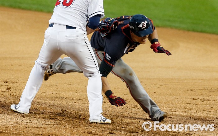 (서울=포커스뉴스) 26일 서울 잠실구장에서 열린 2016 프로야구 한화-두산 경기에서 2회초 한화 신성현이 런다운에 걸려 두산 투수 안규영에게 태그아웃되고 있다.