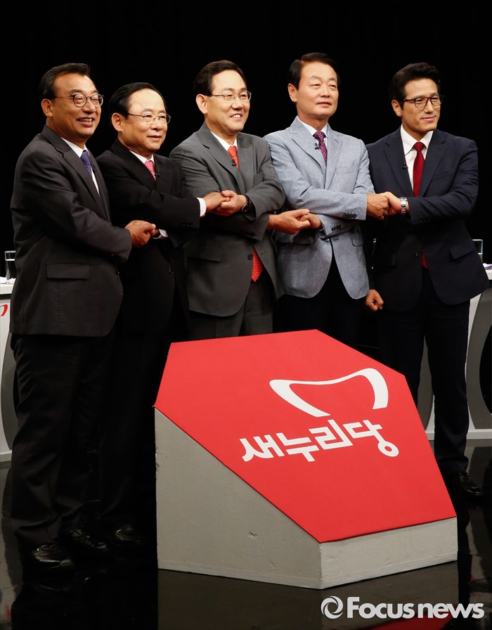 (서울=포커스뉴스) 29일 오후 서울 마포구 상암동 DMC에서 종합편성채널 채널A 주최로 열린 새누리당 대표 경선 1차 토론회에 참석한 의원들이 토론에 앞서 포즈를 취하고 있다. 왼쪽부터 이정현, 이주영, 주호영, 한선교, 정병국 의원.