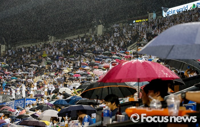 (서울=포커스뉴스) 26일 서울 잠실구장에서 열린 2016 프로야구 한화-두산 경기가 폭우로 중단된 가운데 관중들이 우산과 비옷으로 비를 피하고 있다.