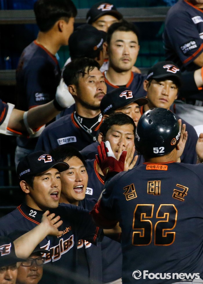(서울=포커스뉴스) 26일 서울 잠실구장에서 열린 2016 프로야구 한화-두산 경기 7회초 2사 1,2루 상황에서 3점 홈런을 친 후 동료들과 손뼉을 마주치고 있다.