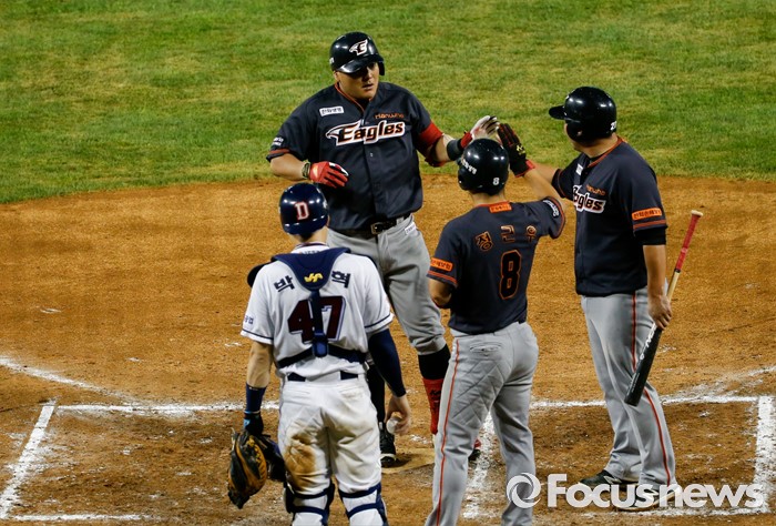 (서울=포커스뉴스) 26일 서울 잠실구장에서 열린 2016 프로야구 한화-두산 경기 7회초 2사 1,2루 상황에서 3점 홈런을 친 후 홈을 밟고 있다.