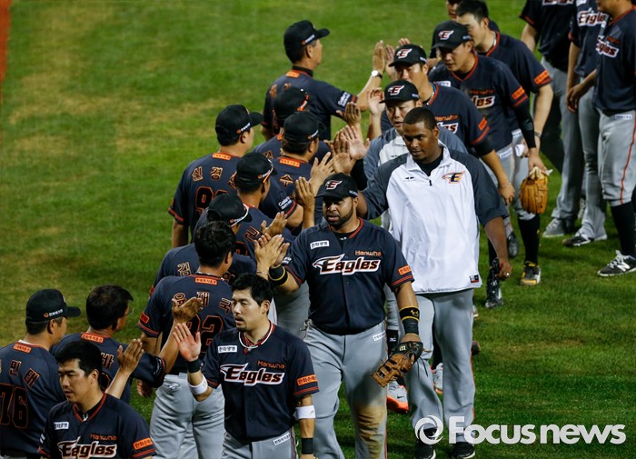 (서울=포커스뉴스) 29일 서울 잠실구장에서 열린 2016 프로야구 한화-두산 경기 연장 11회말 한화가 승리를 결정지은후 선수들과 감독, 코칭스태프들이 손뼉을 마주치고 있다.