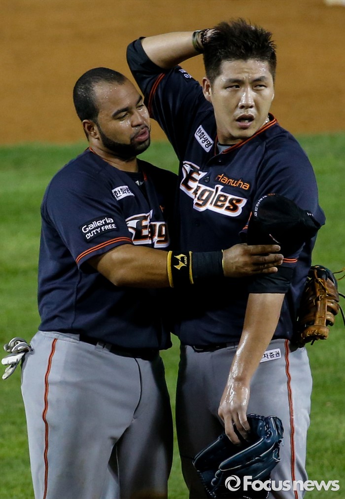 (서울=포커스뉴스) 29일 서울 잠실구장에서 열린 2016 프로야구 한화-두산 경기 연장 11회말 한화 투수 권혁이 승리를 확정지은 후 로사리오의 포옹을 받고 있다.