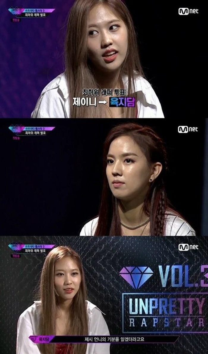 이에 육지담은 “겉모습에도 랩에도 신경을 다 썼는데 몰랐나보다”며 “제시 언니 기분을 알겠다. 왜 '난쟁아 잘 들어봐'라고 했는지”라고 제이니의 평에 불쾌함을 드러냈다.래퍼 육지담이 29일 첫 방송된 '언프리티 랩스타 시즌3'의 첫 번째 트랙 미션 원테이크 싸이퍼 뮤직비디오 촬영 후 자신을 최하위로 꼽은 제이니에 불쾌함을 표현했다. 사진은 방송 캡처. <사진출처=Mnet>
