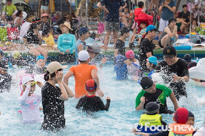 (서울=포커스뉴스) 30일 오전 서울 마포구 망원한강공원 수영장을 찾은 시민들이 물놀이를 즐기고 있다.