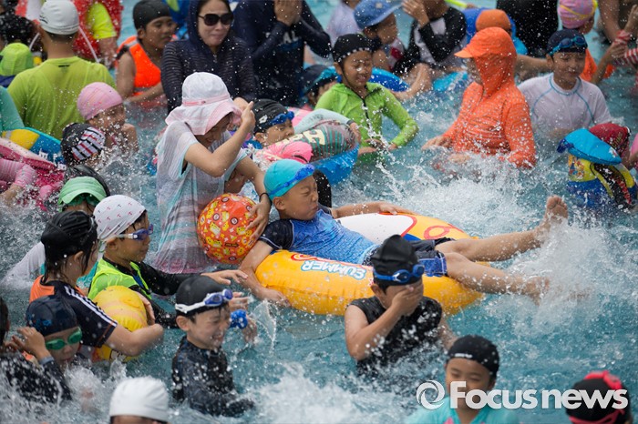 (서울=포커스뉴스) 30일 오전 서울 마포구 망원한강공원 수영장을 찾은 시민들이 물놀이를 즐기고 있다.