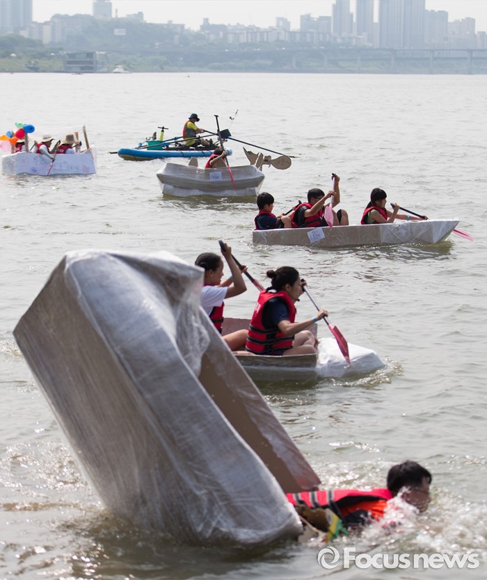 (서울=포커스뉴스) 30일 오후 서울 송파구 잠실한강공원에서 열린 한강 종이배 경주대회 '박스원레이스'에 참가한 시민들이 탄 종이배가 침몰하고 있다.