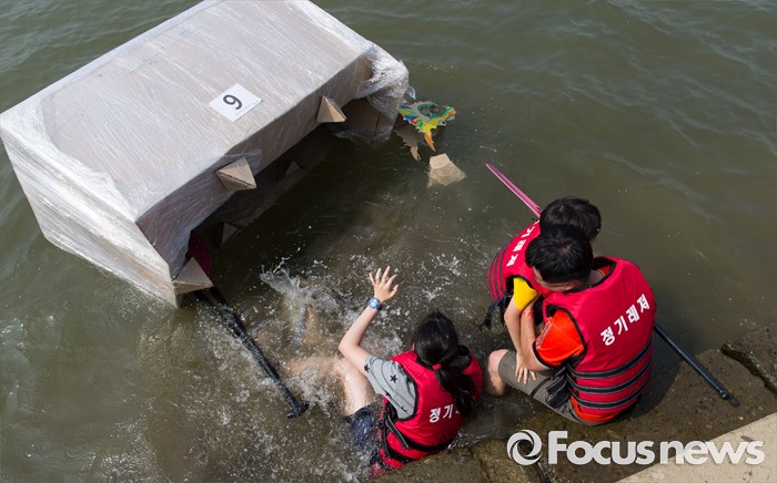 (서울=포커스뉴스) 30일 오후 서울 송파구 잠실한강공원에서 열린 한강 종이배 경주대회 '박스원레이스'에 참가한 시민들이 직접 제작한 종이배에 탑승 중 침몰하고 있다.