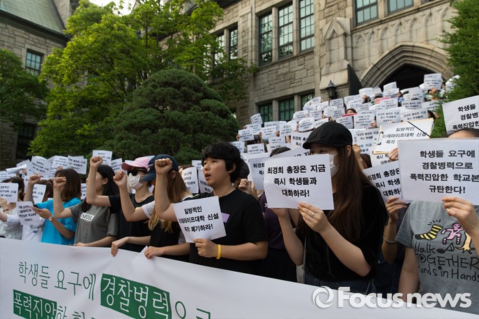 (서울=포커스뉴스) 30일 오후 서울 서대문구 이화여자대학교 본관 앞에서 고졸 출신 직장인 등을 위한 단과대 설립을 반대하는 학생들이 경찰의 폭력 진압 의혹 기자회견 중 폭력진압 학교본부 규탄 구호를 외치고 있다. 이날 오후 경찰은 학교 측 요청으로 갇혀 있던 교수, 교직원을 데리고 나왔으며 이 과정에서 경찰과 재학생 간 충돌이 있었다.