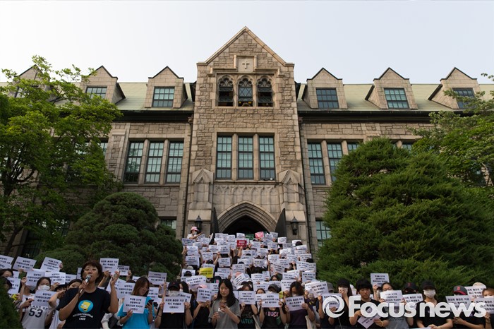 (서울=포커스뉴스) 30일 오후 서울 서대문구 이화여자대학교 본관 앞에서 고졸 출신 직장인 등을 위한 단과대 설립을 반대하는 학생들이 경찰의 폭력 진압 의혹 기자회견을 하고 있다. 이날 오후 경찰은 학교 측 요청으로 갇혀 있던 교수, 교직원을 데리고 나왔으며 이 과정에서 경찰과 재학생 간 충돌이 있었다.
