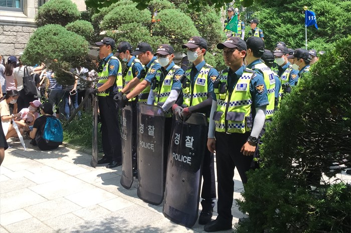 (서울=포커스뉴스) 30일 오후 서울 서대문구 이화여대 본관 앞에서 경찰들이 고졸 출신 직장인 등을 위한 단과대 설립을 반대하는 학생들과 대치하고 있다. <사진제공=이화여대 재학생>