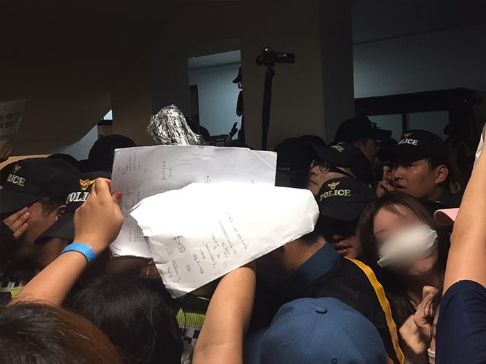 (서울=포커스뉴스) 30일 오후 서울 서대문구 이화여대 본관에서 경찰들이 고졸 출신 직장인 등을 위한 단과대 설립을 반대하는 학생들과 충돌하고 있다. <사진출처=이화여대 총학생회 공식 페이스북>
