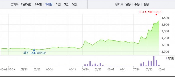 이는 2주 전 주가인 15일(2360원)과 비교했을 때 81.7% 상승한 수치다.
