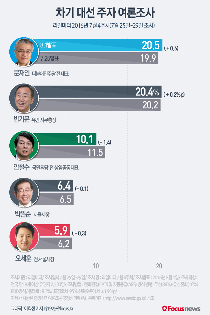 (서울=포커스뉴스) 1일 발표한 여론조사 기관 리얼미터 2016년 7월 4주차 주간집계에 따르면 차기 대선 주자 여론조사에서 문재인 더불어민주당 전 대표가 반기문 유엔사무총장을 0.1%의 근소한 차이로 역전했다. 이는 반총장이 여론조사에 참여한 6월 1일 이후 처음이다.