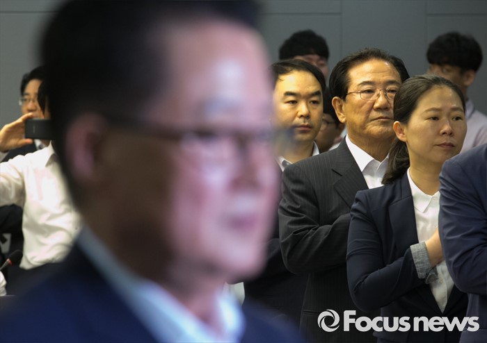 (서울=포커스뉴스) 2일 오전 서울 여의도 국회 의원회관에서 열린 국민의당 의원총회에 참석한 박지원 비상대책위원장과 박준영 의원 등 의원들이 국기에 대한 경례를 하고 있다. 검찰은 수억 원대 공천헌금을 수수한 혐의로 박준영 의원에 대해 구속영장을 재청구했지만 기각됐다.