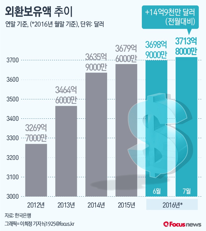 3일 한국은행은 7월말 현재 우리나라 외환보유액은 3713억8000만달러(약 412조4174억원)라고 밝혔다.