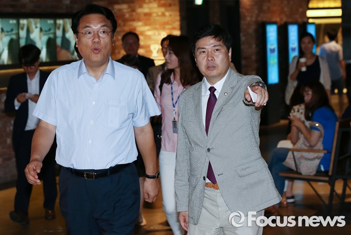 (서울=포커스뉴스) 정진석(왼쪽) 새누리당 원내대표와 지상욱 대변인이 1일 오후 서울 여의도 한 영화관에서 영화 '인천상륙작전' 관람을 위해 이동하고 있다.