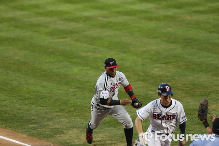 (서울=포커스뉴스) 2일 오후 서울 잠실구장에서 열린 2016 프로야구 LG-두산 경기 3회말 1사 2루 상황, 김재호가 히메네스의 런다운을 피해 홈 베이스로 질주하고 있다.