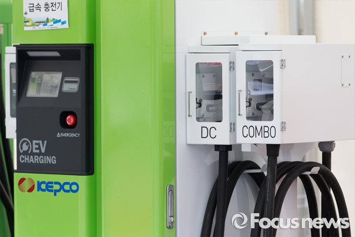 (서울=포커스뉴스) 2일 오후 서울 마포구 상암월드컵경기장에서 열린 개방형 전기차 충전소 1호 착공식에서 급속충전기가 전시돼 있다.