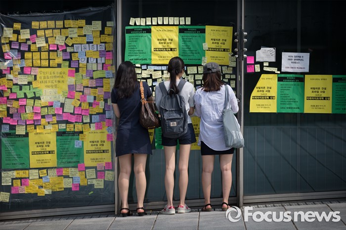 3일 오후 서울 서대문구 이화여자대학교에서 평생교육 단과대학 '미래라이프대학 설립을 반대하는 이화여대 학생들이 단과대학 철회 소식을 들은 후에도 계속해 시위를 이어가고 있다.