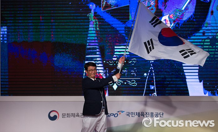 (서울=포커스뉴스) 2일 오후 서울 송파구 올림픽파크텔에서 열린 2016 리우 패럴림픽 대한민국 선수단 결단식에 참석한 정재준 선수단장이 김성일 대한장애인체육회 회장에게 전달받은 태극기를 흔들고 있다.